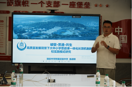 首先,瑞安中学附属初级中学的施德峰老师作《破壁·贯通·共生:高质量发展背景下大中小学思政课一体化长效机制学校实践研究》课题分享,从管理角度探究学校思政课堂发展的潜能、路径与效果。施老师从“‘破壁’机制:构建跨学段协同新格局”到“‘贯通’路径:打造一体化教学新体系”到“‘共生’生态:健全多元协同育人网络”三个方面,具体阐述了他对思政课堂的设想与愿景。